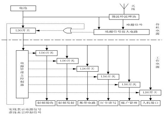 如OBU這種以嵌入式處理器為核心的系統(tǒng),其功耗主要由處理器功耗和外圍電路功耗組成??紤]實(shí)際的運(yùn)行情況,汽車(chē)在公路上行駛的整個(gè)過(guò)程中,經(jīng)過(guò)收費(fèi)站的時(shí)間是非常短的,OBU只需要在汽車(chē)經(jīng)過(guò)收費(fèi)站時(shí)工作,而且工作時(shí)間不到一秒鐘,其他絕大部分時(shí)間都不需要工作。OBU智能電源管理采用電池供電的方法,控制OBU 工作在兩種模式,睡眠模式和激活模式;當(dāng)車(chē)進(jìn)入收費(fèi)站時(shí),OBU被激活,開(kāi)始工作,處于激活模式;當(dāng)交易完成,車(chē)離開(kāi)收費(fèi)站后,OBU馬上停止工作進(jìn)入睡眠模式。根據(jù)這種特點(diǎn),對(duì)電源采用分級(jí)管理的策略,即分為待機(jī)電源與工作電源,如圖2.1。