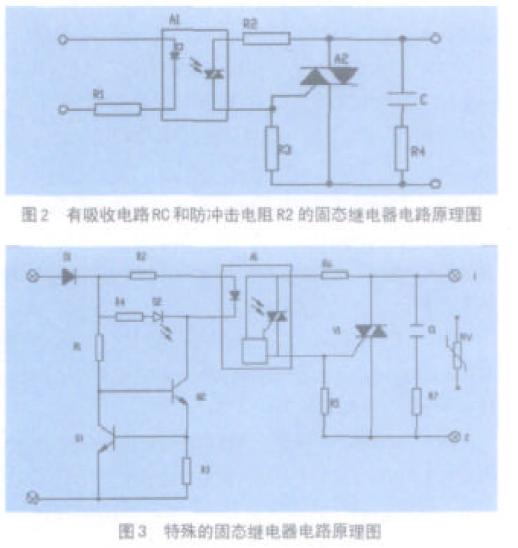 圖1、圖2 和圖3 三種電路都能實現(xiàn)固態(tài)繼電器的功能。圖1 是固態(tài)繼電器最簡單的電路原理圖,圖中A1 是交流光耦,A 2 是雙向可控硅。常用在小型的S S R ,使用時,用戶往往在外面增加器件來改善性能。圖2 是在圖1 的基礎(chǔ)上增加了RC 吸收電路和防沖擊電阻R2 。R 2是保護(hù)光耦,抑制在導(dǎo)通瞬間流過光耦的沖擊電流。附加這些器件后,大大改善了SSR 的EMC 特性和浪涌對光耦的沖擊性能。因此該電路常用在可靠性較高的場合。圖3 是一種特殊的電路,常用在高可靠性和E M C 等級較高的SSR 設(shè)計中。圖中的二極管D1 可防止輸入反極性。由Q1、Q2、R1 及R3 組成恒流電路,保證當(dāng)輸入電壓變化時,光耦A(yù) 1 的電流恒定。R C 電路C 1 、R 7 和R 6 的功能與圖2 的相同。該電路還增加了壓敏電阻R V 。R V不僅加強了S S R 的過壓保護(hù)能力,而且大大改善了其E M C 性能。