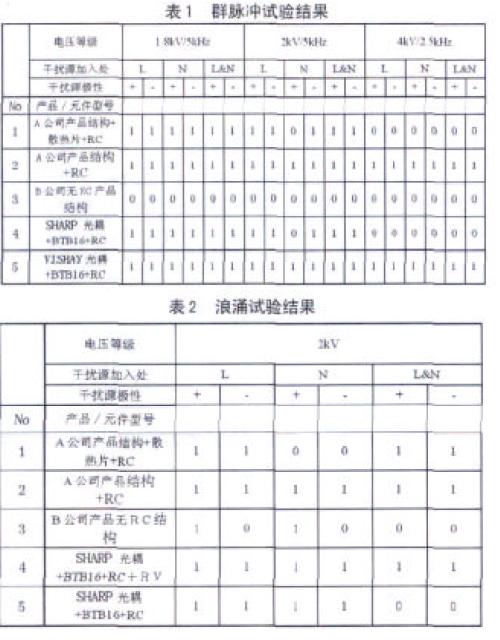 采用不同的樣品(見下)進(jìn)行以下兩種試驗:群脈沖試驗(見表1)和浪涌試驗(見表2)。