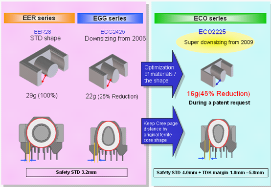 活用高性能材質(zhì)的優(yōu)點,以EER28市面上最常用的一種變壓器型號分析。由于密度更大,我們可以使變壓器更輕、更小。比如在同樣功率的情況下,用高性能材質(zhì)體積和重量會比普通材質(zhì)更小。這邊僅以EER28為例,我們將以ECO2225系列可以取代市場上的EER28,重量有45%的消減。