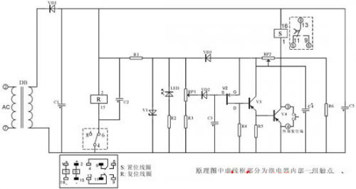 由V2 P溝道場效應(yīng)管、V3、V4三極管以及繼電器為主要器件構(gòu)成的斷電延時型繼電器示于圖2。如下:端加入工作電源后,C1~C5都按其回路完成充電過程(充電時間應(yīng)參照產(chǎn)品規(guī)定的時間)。同時內(nèi)部2繞組閉鎖繼電器R復(fù)位線圈得電工作(虛框內(nèi)轉(zhuǎn)換觸點4與6由電源接通轉(zhuǎn)為斷開狀態(tài),4與8接通),相應(yīng)外部觸點進(jìn)行轉(zhuǎn)換端接通,呈延時工作狀態(tài))。