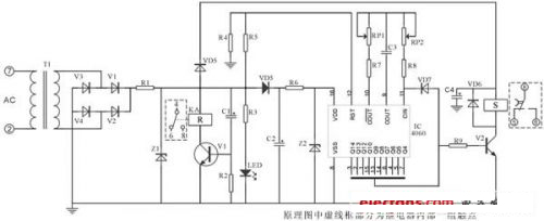該電路核心部分由IC4541構(gòu)成,延時設(shè)定由RP2、C*設(shè)定,A-B端根據(jù)需求接相應(yīng)高、低電平(設(shè)定端)內(nèi)部2繞組閉鎖繼電器采用DC12V(因繼電器工作電壓與IC4060組成延時電器要低,則為保證其驅(qū)動則分別由V6、V7、V1、V3構(gòu)成)。其中C2為二次儲能器件,可根據(jù)延時的長短予以調(diào)整,C4為完成S置位線圈工作。