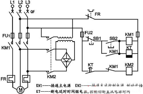 制動過程:按下停止按鈕SB1→KM1斷電,KM1主觸點斷開,電機脫離電源,KM1輔助常閉觸點恢復(fù)閉合,KM2通電,接入直流電源,制動開始,同時KM1輔助常開觸點又恢復(fù)斷開,則KT線圈呈斷電狀態(tài),延時開始,待所設(shè)延時時間到達(dá)后,KT的延時斷開常開觸點恢復(fù)斷開,KM2失電,切斷直流電源,制動結(jié)束。