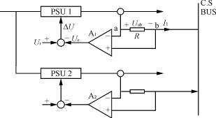 如圖5所示,當(dāng)輸出達(dá)到均流時(shí),輸出電流I1為零。反之,則電阻R上由于有電流I1流過,在其兩端產(chǎn)生一個(gè)電壓Uab,這個(gè)電壓經(jīng)過放大器A輸出電壓Uc,它與基準(zhǔn)電壓Ur比較后的ΔU,反饋回電源模塊的控制部分,從而調(diào)節(jié)輸出電流,最終實(shí)現(xiàn)均流。