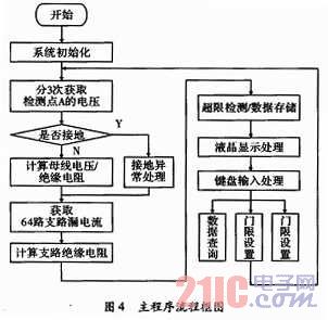 整個(gè)程序的編寫均由C語(yǔ)言完成,在程序設(shè)計(jì)中,采用了結(jié)構(gòu)化程序設(shè)計(jì)方法,使各個(gè)模塊程序相對(duì)獨(dú)立,便于程序代碼的維護(hù)、移植和升級(jí)。同時(shí),這樣分離式的程序設(shè)計(jì),降低了代碼的調(diào)試難度,縮短了調(diào)試周期。將與接地故障信息(如母線電壓,母線絕緣電阻,支路絕緣電阻,接地支路號(hào)等)密切相關(guān)的數(shù)據(jù)放在一個(gè)結(jié)構(gòu)體里,便于掉電存儲(chǔ)與回放顯示。系統(tǒng)的主程序流程圖,如圖4所示。