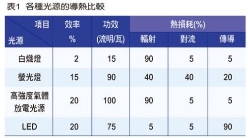 在此情況下,約20%輸入功率轉(zhuǎn)換為光,80%則轉(zhuǎn)換為熱。這取決于多種因素,發(fā)熱可能與底層不規(guī)則以及聲子發(fā)射、密封、材料等有關(guān)。在LED產(chǎn)生的總熱量中,有90%透過(guò)傳導(dǎo)傳輸。表1為耗散來(lái)自LED接面的熱量,傳導(dǎo)是導(dǎo)熱的主要通道,因?yàn)閷?duì)流和輻射僅占全部熱傳輸約10%。比如一個(gè)LED可能轉(zhuǎn)換近10.72瓦熱量(13.4瓦×0.8)。其中,9.648瓦(10.72瓦×0.9)透過(guò)傳導(dǎo)從LED接面?zhèn)鬏敾蜻w移。顯然,LED光源需要精確的功率和熱管理系統(tǒng),因?yàn)榕c其他光源相比,提供給LED的電能大部分轉(zhuǎn)換為熱量。如果沒(méi)有適當(dāng)?shù)臒峁芾?,這種熱量會(huì)影響LED壽命和色彩輸出。同時(shí)由于LED驅(qū)動(dòng)裝置屬于硅組件,很快就會(huì)失效,因此必須配備故障安全備用過(guò)電流保護(hù)裝置。