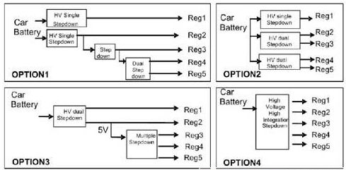 這里列出了四種常用的電源架構(gòu),總結(jié)了最近三年汽車領(lǐng)域的典型設(shè)計(jì)架構(gòu)。當(dāng)然,用戶可以通過不同方式實(shí)現(xiàn)具體的設(shè)計(jì)要求,多數(shù)方案可歸納為這四種結(jié)構(gòu)中的一種。