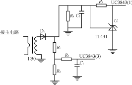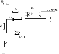 電壓反饋電路如圖3所示,輸出電壓通過集成穩(wěn)壓器TL431和光耦反饋到UC3843(1)腳,調(diào)節(jié)R1、R2分壓比可設(shè)定和調(diào)節(jié)輸出電壓,達到較高的穩(wěn)壓精度。如果輸出電壓Uo升高,集成穩(wěn)壓器TL431陰極到陽極的電流增大,使光耦輸出三極管電流增大即UC3843(1)腳對地的分流變大,UC3843輸出脈寬相應(yīng)變窄,輸出電壓Uo減小。同樣地,如果輸出電壓Uo減小,可通過反饋調(diào)節(jié)使之升高。
