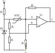 圖4為變壓器過熱保護電路,R3=R4,NTC為粘貼在變壓器上的負溫度系數(shù)的熱敏電阻,常溫下RNTCR2,運放U1構(gòu)成滯環(huán)比較器。正常工作時,NTC阻值較大,運放U+<U-,輸出為零;當溫度上升到設(shè)定值時,運放U1輸出為高電平,送到PWM控制芯片使輸出脈沖關(guān)斷。