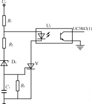 圖5為輸出過電壓保護電路。穩(wěn)壓管DZ的擊穿電壓稍大于輸出電壓額定值,輸出正常時,DZ不導(dǎo)通,晶閘管V門極電壓為零,不導(dǎo)通。當輸出過壓時DZ擊穿,V受觸發(fā)導(dǎo)通,使光耦輸出三極管電流增大,通過UC3843控制開關(guān)管關(guān)斷。