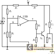 圖6為空載保護電路。為了防止變壓器繞組上電壓過高,同時也為了使電源從空載到滿載的負載效應(yīng)較小,開關(guān)穩(wěn)壓電源輸出端一般不允許開路。圖6中R2R3,給運放同相輸入端提供固定的小電壓U+。R8為取樣負載電流的分流器,當外電路未接負載RL時,R8上無電流,運放反相輸入端電壓U-=0,因而U+>U-,運放輸出電壓較高,使三極管V1飽和導(dǎo)通,將電源內(nèi)部的假負載R7自動接入。當電源接入負載RL時,R8上的壓降使U->U+,運放輸出電壓為零,V1截止,將R7斷開。