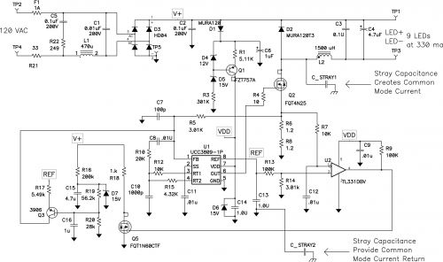 非隔離式電源的共模電流可能成為一個(gè)電磁干擾 (EMI) 源,您是否曾經(jīng)消除過(guò)它呢?在一些高壓電源中,例如:LED 燈泡所使用的電源,您可能會(huì)發(fā)現(xiàn)您無(wú)法消除它們。經(jīng)仔細(xì)查看,發(fā)現(xiàn)非隔離式電源與隔離式電源其實(shí)并沒(méi)有什么兩樣。開(kāi)關(guān)節(jié)點(diǎn)接地寄生電容,產(chǎn)生共模電流。