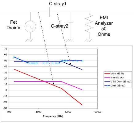 上升時(shí)間控制通過(guò)降低電源的開(kāi)關(guān)速度來(lái)限制高頻譜,最適合解決 10MHz 以上的 EMI 問(wèn)題。減小開(kāi)關(guān)節(jié)點(diǎn)的寄生電容很容易,只需最小化蝕刻面積或者使用屏蔽材料。該節(jié)點(diǎn)到整流電源線路的電容,不會(huì)形成共模電流,因此您可以將導(dǎo)線埋入多層型印制線路板 (PWB),從而減少大量不需要的電容。但是,您無(wú)法徹底消除它,因?yàn)?FET 漏極和電感仍然余留有電容。圖 2 給出了一幅曲線圖,引導(dǎo)您逐步計(jì)算 EMI 頻譜。第一步是計(jì)算電壓波形(紅色)的頻譜。通過(guò)計(jì)算漏電壓波形的傅里葉級(jí)數(shù),或者只需計(jì)算基本分量然后對(duì)包線取近似值(1除以調(diào)和數(shù)和基本分量),便可完成上述計(jì)算。在高頻完成進(jìn)一步的調(diào)節(jié)(1/ (pi *上升時(shí)間)),如7MHz以上頻率所示。下一步,用該電壓除以寄生電容的電抗。有趣的是,低頻輻射為扁平穩(wěn)定狀態(tài),直到頻率穿過(guò)由上升時(shí)間設(shè)定的極點(diǎn)為止。最后,CISPR B 類規(guī)定也被繪制成圖。僅 0.1 pF 的寄生電容和一個(gè)高壓輸入,輻射就已接近于規(guī)定值。