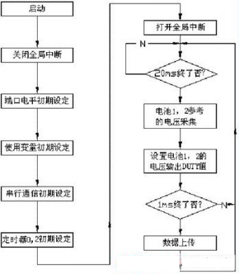 為了驗(yàn)證本文的均衡充電方法,以兩節(jié)單體電池組成的蓄電池組為例進(jìn)行實(shí)驗(yàn)和分析,主要驗(yàn)證旁路中開(kāi)關(guān)管對(duì)電壓的調(diào)節(jié)作用??刂屏鞒桃?jiàn)圖4。