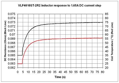 圖5中所示的測試示例在LM3554的電路中使用了VLS4010ST-2R2,直流電流階躍為1.65A。室溫時的電阻開始時為65mΩ。超過30秒之后,電感器達(dá)到穩(wěn)態(tài),電阻變?yōu)?3mΩ,相應(yīng)的穩(wěn)態(tài)工作溫度大約為 56℃。
