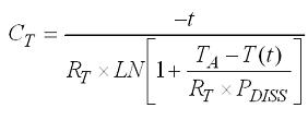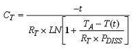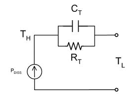 該模擬可以深入進(jìn)行,以描述器件的另一個熱屬性,稱之為熱容。正如將熱阻模擬為電阻,可以將熱容(CT,單位為J/℃)模擬為電容。將熱容與熱阻并聯(lián)獲得熱阻抗(ZT)。圖1所示為傳導(dǎo)傳熱的簡化RC模型。能源被模型化為電流源,熱阻抗被模型化為CT與RT并聯(lián)。