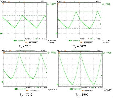 圖4左上圖顯示了在飽和點(diǎn)以下工作的電感器,具有正常的三角電流波形,可由(V/L×Δt)算出。在峰值電流保持相同且溫度升至50℃(右上圖)時,電感電流斜率開始增至1.76A標(biāo)記附近,指示顯示電感器的飽和點(diǎn)隨著溫度上升而向下移動。當(dāng)溫度升到70℃, 然后升到85℃時,隨著電感器達(dá)到飽和整個電流波形最終出現(xiàn)。