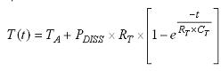 在穩(wěn)態(tài)下,LEDI/NTC的ESD二極管的VF為-622mV,對應(yīng)結(jié)溫 95.2℃(環(huán)境溫度為25℃時)。在穩(wěn)定狀態(tài)下,測得的PFET導(dǎo)通電阻為154mΩ,對應(yīng)結(jié)溫105℃。圖3 還描繪了LM3554的熱容。VF和RPMOS的響應(yīng)表現(xiàn)呈現(xiàn)類似于一階RC的指數(shù)級上升,計(jì)算等式如下:
