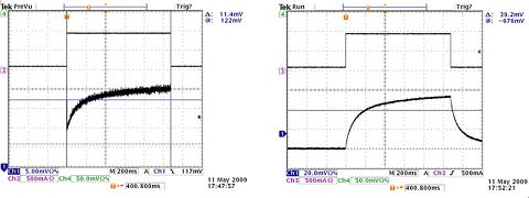 因?yàn)殡娏饔行┹p微依賴MOSFET的導(dǎo)通電阻,所以有必要在電流接近目標(biāo)閃光電流時測量 PFET電阻。使用大測試電流的問題是它們可能導(dǎo)致器件發(fā)熱??朔藛栴}的方法是將閃光超時時間設(shè)置為最低 32ms,并在示波器上測量PFET的電壓降。在+25℃到+125℃的情況下,使用1.2A閃光電流,結(jié)果顯示的斜率大約為 0.42mΩ/℃ 。要注意的一個事情是PFET通過VOUT引腳供電,因此VOUT=5V時,其導(dǎo)通電阻會低于VOUT=3.9V時的電阻值。