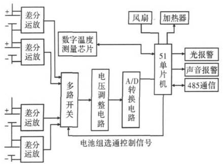 狀態(tài)采集模塊包括對(duì)單體電池的電壓和電池組的溫度等參數(shù)進(jìn)行采集,然后待測(cè)量信號(hào)進(jìn)行處理,通過A/D轉(zhuǎn)換器采樣后傳輸給單片機(jī)進(jìn)行數(shù)據(jù)處理,將有效數(shù)據(jù)通過串口傳到本地PC 機(jī),監(jiān)測(cè)人員可以通過對(duì)狀態(tài)數(shù)據(jù)的進(jìn)行分析從而掌握電池組的工作情況,對(duì)不安全的狀態(tài)進(jìn)行及時(shí)的處理,確保其工作的可靠性。