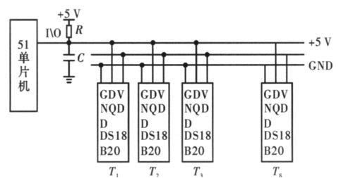 針對(duì)串聯(lián)電池組,傳統(tǒng)的測(cè)溫方法多采用模擬溫度傳感器進(jìn)行測(cè)量,在數(shù)據(jù)的采集和傳輸過程中易受外界環(huán)境的干擾,從而使測(cè)得的結(jié)果誤差較大,且當(dāng)測(cè)量點(diǎn)較多時(shí),連線較復(fù)雜。文中采用單片機(jī)和單總線數(shù)字式溫度傳感器DS18B20 來解決上述問題。其原理如圖5 所示。