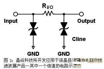 晶焱科技(Amazing Microelectronic Corp.)在靜電放電防護(hù)技術(shù)上已累積了豐富的經(jīng)驗(yàn)與技術(shù)。公司開發(fā)的應(yīng)用于液晶顯示器的電磁干擾濾波器產(chǎn)品基本架構(gòu)如圖2所示。由圖2電路示意圖可知:π型低通濾波器的Input與Output之間是采用電阻(RI/O)組件橋接,Input端點(diǎn)及Output端點(diǎn)對GND的電容則是采用雙向?qū)?bi-directional)的瞬時(shí)電壓抑制器(TVS)。因此,該系列產(chǎn)品除了可以提供良好的低通濾波效果之外,還擁有很好的靜電放電防護(hù)效果。