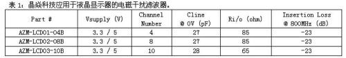表1所列為晶焱科技已推出的應(yīng)用于液晶顯示器的電磁干擾濾波器系列產(chǎn)品。適用于5V以下的額定電壓電路系統(tǒng),線電容值約為27微微法拉(pF)。操作頻率在800百萬赫茲(MHz)時(shí),其功率損耗可達(dá)-23dB,可以顯著地降低電磁干擾信號(hào),以維持受保護(hù)電路的操作功能正常。晶焱科技同時(shí)推出三種不同通道數(shù)的電磁干擾濾波器產(chǎn)品,以方便其客戶依照不同需求選用合適的產(chǎn)品。