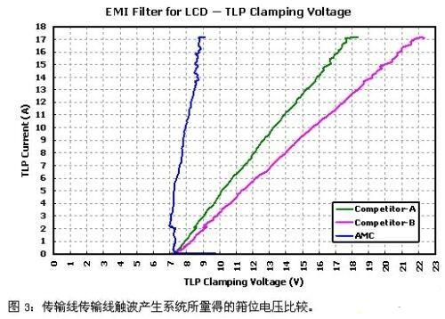 在靜電放電事件的高導(dǎo)通電流下,瞬時(shí)電壓抑制器的箝位電壓越低則越能適時(shí)地被導(dǎo)通,以使受保護(hù)電路免于遭受靜電放電的侵害而永久受損失效。圖3所示為利用傳輸線脈沖產(chǎn)生系統(tǒng)(TLP)所量得的箝位電壓比較圖。由圖中可以清楚看到,晶焱科技應(yīng)用于液晶顯示器的電磁干擾濾波器,在17安培的高靜電放電電流下具有最低的箝位電壓,可以非常有效地提供受保護(hù)電路一個(gè)快速有效的靜電放電旁通路徑。