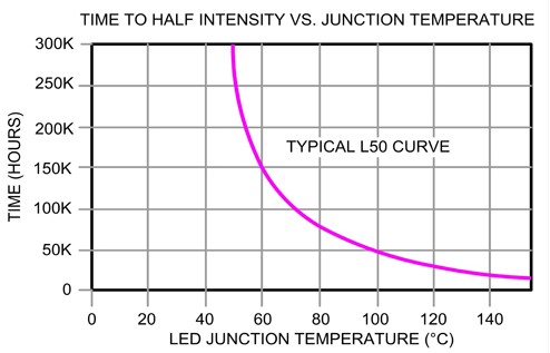 每種照明設(shè)備均存在光源使用壽命問題,經(jīng)常遭遇的狀況有類似白熾燈泡的鎢絲突然燒斷,或因長時(shí)間使用而使得光源材料因逐漸老化以致變暗而故障,LED亦因組件的接面溫度而出現(xiàn)老化現(xiàn)象。所有的照明設(shè)備在提供穩(wěn)定亮度條件下,于一定使用年限后,亮度勢必會逐漸低于有效亮度之下。在不同的照明應(yīng)用裝置中,皆有使用壽命時(shí)間限制。舉例來說,當(dāng)使用在路燈裝置的亮度已衰減至原先50%時(shí),即代表使用年限,但使用在醫(yī)生內(nèi)視鏡的光源裝置可能亮度尚未衰減那么多。