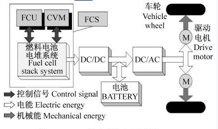 (1)串聯(lián)式—下圖中采用的電力電子裝置只有電機控制器,電池和輔助動力裝置都直接并接在電機控制器的入口,屬于串聯(lián)式,車輛的驅(qū)動力只來源于電動機。