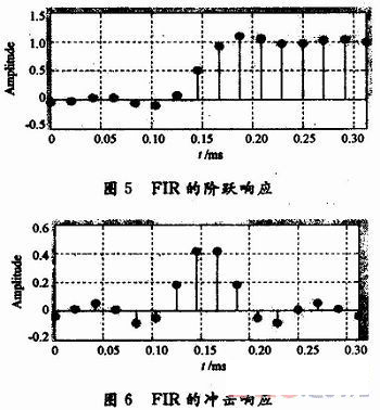 點擊“design filter”即可。值得注意的是,這里選擇filter order為15階,而不是所設計的16階濾波器。因為常數(shù)系數(shù)項h(0)=0。通過菜單“analysis”選擇“magnitude”和“phase response”即可得到圖3,圖4的特性顯示。“analysis”選擇“step response”和“im-pulse”可以得到圖5,圖6的響應顯示。可以看出所設計FIR濾波器的階躍響應和沖擊響應比較接近理想狀態(tài)。