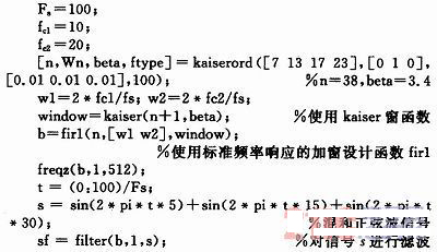 Matlab信號處理工具箱提供了各種窗函數(shù)、濾波器設計函數(shù)和濾波器實現(xiàn)函數(shù)。設計中利用Matlab提供的函數(shù)firl來實現(xiàn),編程則是直接調用這些函數(shù)簡單直觀的完成設計。調用格式:firl(n,Wn,‘ftype’,Window),其中n為階數(shù)、Wn為截止頻率、ftype是濾波器的類型、Window是窗函數(shù)。應用凱塞窗的代碼如下: