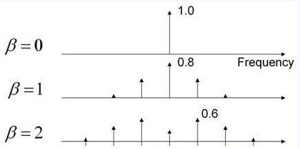 圖1顯示了通過正弦波改變調(diào)制指數(shù)產(chǎn)生的影響。當(dāng)Β=0時,沒有出現(xiàn)頻移,只有一條譜線。當(dāng)Β=1時,頻率特征開始延伸,且中心頻率分量下降了20%。當(dāng)Β=2時,該特征將進(jìn)一步延伸,且最大頻率分量為初始狀態(tài)的60%。頻率調(diào)制理論可以用于量化該頻譜中能量的大小。Carson法則表明大部分能量都將被包含在2*(Δf+fm)帶寬中。