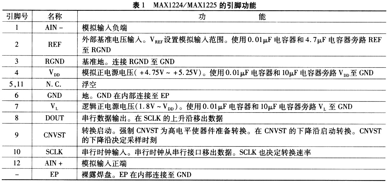MAXl224/MAXl225采用小巧的12引腳TQFN封裝,其引腳排列如圖1所示。各個(gè)引腳的功能如表l所示。