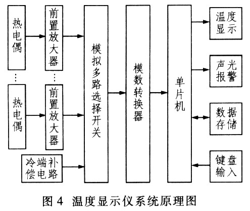 根據(jù)以上要求,筆者在溫度顯示儀的設(shè)計(jì)中以AT89C51型單片機(jī)為核心,采用MAX1224型12位串行A/D轉(zhuǎn)換器構(gòu)成采樣模塊進(jìn)行電路設(shè)計(jì)。溫度顯示儀的主要功能是完成實(shí)時(shí)溫度循環(huán)顯示功能,它主要用于工業(yè)現(xiàn)場(chǎng)中的加熱爐及具有較高溫度的場(chǎng)合,它的測(cè)溫范圍是O℃~1200℃,誤差要求小于±5℃。所設(shè)計(jì)的溫度顯示儀要求具有4路溫度檢測(cè)通道,由熱電偶采集現(xiàn)場(chǎng)溫度,并由冷端補(bǔ)償電路進(jìn)行補(bǔ)償,再由前置放大電路將檢測(cè)到的微小信號(hào)轉(zhuǎn)變?yōu)锳DC可轉(zhuǎn)換的信號(hào)。溫度顯示儀系統(tǒng)原理如圖4所示。