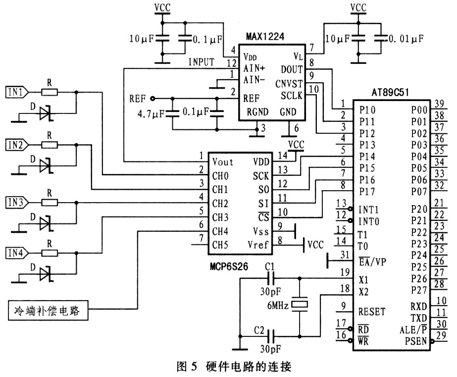 設(shè)計(jì)要求4路溫度檢測(cè)通道和l路冷端補(bǔ)償電路,所以本設(shè)計(jì)采用MCP6S26型6通道增益可編程放大器,該放大器特別適用于多路信號(hào)采集電路的設(shè)計(jì),由于AT89C51單片機(jī)可以通過軟件對(duì)模擬信號(hào)電路進(jìn)行控制,所以其適應(yīng)性和靈活性大大提高。但是,由于AT89C51型單片機(jī)沒有3線制串行總線接口,它與MCP6S26進(jìn)行3線制串行總線的連接時(shí),要使用軟件來模擬3線制串行總線的操作,包括串行時(shí)鐘數(shù)據(jù)輸入和數(shù)據(jù)輸出。McP6S26與AT89C51的連接如圖5所示。圖中,P17模擬片選端CS,P14模擬時(shí)鐘輸入端SCK,P16模擬數(shù)據(jù)輸入端SI,P15模擬數(shù)據(jù)輸出端SO。