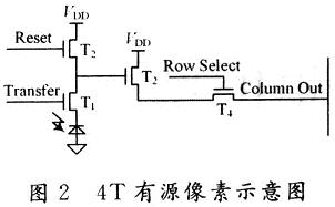 四場效應管(4T)有源像素CMOS圖像傳感器的每個像素由光敏二極管、復位管T2、轉移管T1、源跟隨器T3和行選通開關管T4組成,如圖2所示。
