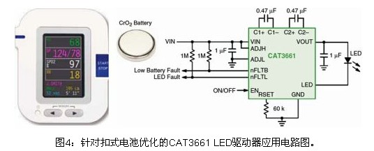 如今,越來越多的創(chuàng)新型便攜設(shè)備采用扣式電池(coin cell)供電,如醫(yī)療應(yīng)用中的血糖儀、數(shù)字體溫計(jì)、血氧計(jì)、呼吸分析儀和生理監(jiān)測儀等。由于這種電池的獨(dú)特特性以及需要長工作壽命,這些緊湊型應(yīng)用需要定制的LED驅(qū)動(dòng)器,不僅要管理背光,還要監(jiān)測電池電量。在這類應(yīng)用中,可以采用安森美半導(dǎo)體計(jì)劃于2010年下半年推出的CAT3661 2至2.5 V單LED驅(qū)動(dòng)器。這器件同樣采用安森美半導(dǎo)體專利的四模(Quad Mode)電荷泵架構(gòu),能效高達(dá)92%,靜態(tài)電流低至約150 μA,提供可調(diào)節(jié)的低電池電量檢測功能,以及強(qiáng)固的LED故障監(jiān)測、軟啟動(dòng)和短路限制等保護(hù)功能,采用低高度的3 x 3 mm TQFN-16封裝,非常適合這些便攜設(shè)備應(yīng)用。