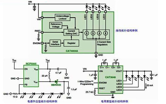 白光LED廣泛用于小型液晶顯示器(LCD)面板及鍵盤背光以及指示器應(yīng)用。高亮度LED則用于手機(jī)和數(shù)碼相機(jī)的閃光光源。這些應(yīng)用需要優(yōu)化的驅(qū)動(dòng)器解決方案,能夠延長電池使用時(shí)間、減小印制電路板(PCB)面積及高度。在這些應(yīng)用領(lǐng)域,常見的LED驅(qū)動(dòng)器方案涉及線性、電感型或電荷泵型不同拓?fù)浣Y(jié)構(gòu),各有其特點(diǎn)。例如,電感型方案總能效最佳;電荷泵方案由于使用低高度陶瓷電容,占用的電路板面積和高度極??;線性方案非常適合色彩指示器以及簡單的背光應(yīng)用。安森美半導(dǎo)體提供所有這三種類型拓?fù)浣Y(jié)構(gòu)的LED驅(qū)動(dòng)器方案(參見圖1),滿足用戶不同的應(yīng)用需求。