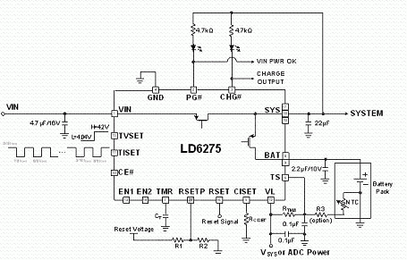 為滿足低耗電可攜式產(chǎn)品對于更精確、更安全的充電器應(yīng)用需求,許多IC制造商發(fā)展出低成本線性充電器。圖2是以通嘉科技的LD6275充電IC為設(shè)計范例,構(gòu)成僅需少數(shù)外部零件的獨立式線性充電器電路,其具備1.5A的最大充電電流。