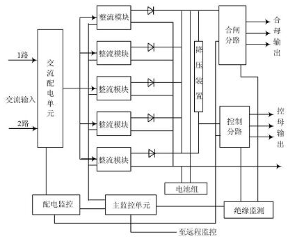 智能高頻開關(guān)電源系統(tǒng)的總體結(jié)構(gòu)主要由主監(jiān)控單元、配電模塊、交流配電單元、整流模塊等組成, 系統(tǒng)總體的結(jié)構(gòu)圖如圖1 所示。系統(tǒng)中的各個監(jiān)控單元受主監(jiān)控單元的管理和控制,通過通信線將各個監(jiān)控單元采集的信息送給主監(jiān)控統(tǒng)一管理。主監(jiān)控顯示直流系統(tǒng)各種信息,用戶也可以觸摸顯示屏查詢信息及操作,系統(tǒng)信息還可以接入到遠(yuǎn)程監(jiān)控系統(tǒng)中。系統(tǒng)除了交流監(jiān)控、直流監(jiān)控、開關(guān)量監(jiān)控等基礎(chǔ)單位外,還配置了絕緣監(jiān)測、降壓裝置、電池巡檢等功能單元,以達(dá)到對直流系統(tǒng)進(jìn)行全面監(jiān)控的目的。