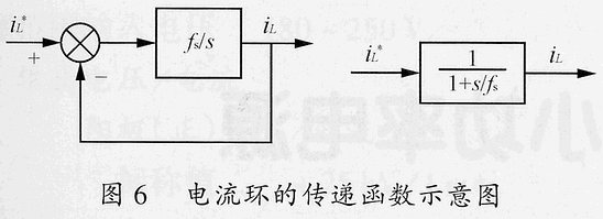 將s=2πfc代入上式,并令上式等于1時(shí),可得環(huán)路的剪切頻率fc=fs/(2π)。因此,可將電流環(huán)等效為延時(shí)時(shí)間常數(shù)為一個(gè)開關(guān)周期的純慣性環(huán)節(jié),如圖6所示。顯然,當(dāng)電流誤差放大器的增益GCA小于最優(yōu)值時(shí),電流響應(yīng)的延時(shí)將會(huì)更長(zhǎng)。