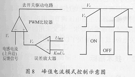 平均CMC由于要采樣濾波電感的電流,有時(shí)顯得不太方便,因此,實(shí)踐中經(jīng)常采用一種變通的電流模式控制方法,即峰值CMC,如圖8所示。電壓外環(huán)輸出控制量(Vc)和由電感電流上升沿形成的斜坡波形(Vs)通過(guò)電壓比較器進(jìn)行比較后,直接得到開關(guān)管的關(guān)斷信號(hào)(開通信號(hào)由時(shí)鐘自動(dòng)給出),因此,電壓環(huán)的輸出控制量是電感電流的峰值給定量,由電感電流峰值控制占空比。