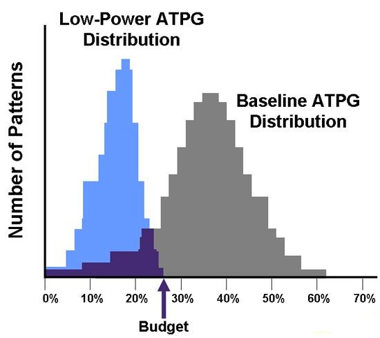 然而,如果我們采用相關(guān)技術(shù)降低測試期間的功耗,我們就能有效地將這種分布向左移。在圖1中重疊的藍色低功率分布區(qū),掃描ATPG向量的峰值開關(guān)活動沒有超過功率預(yù)算,因此降低了制造測試中功率問題產(chǎn)生的風(fēng)險。