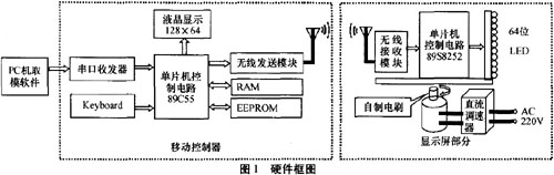 硬件系統(tǒng)主要有移動控制器和顯示屏兩部分組成,如圖1所示。移動控制器主要負(fù)責(zé)接收PC機(jī)端軟件取摸數(shù)據(jù)、加入控制字符并保存,還能向顯示屏發(fā)送特定控制命令、切換顯示內(nèi)容、改變顯示效果。顯示屏主要有電機(jī)控制轉(zhuǎn)速和單片機(jī)控制E3jLED顯示內(nèi)容等。