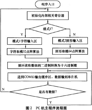 軟件采用實時的方式取模:數(shù)據(jù)圖形—數(shù)據(jù)。通過引入圖形這個中間量,使得提取字模變得靈活,無論任何字體、符號,都可以實現(xiàn)即時轉(zhuǎn)換。Pc機(jī)軟件主程序流程圖見圖2。