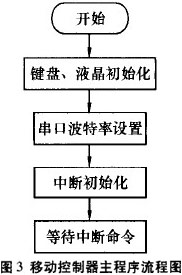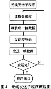 程序上電初始化后,處于等待狀態(tài)。當(dāng)串口中斷一來I臨,優(yōu)先處理串口中斷.發(fā)送無線數(shù)據(jù)是通過鍵盤、菜單控制。移動控制器主程序流程圖見圖3;無線發(fā)送子程序見圖4。