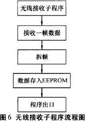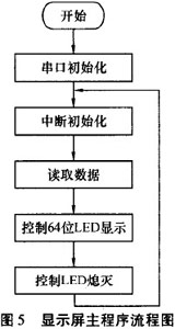 由單片機(jī)控制LED的亮滅和無線數(shù)據(jù)的接收.數(shù)據(jù)通過無線模塊接收后,單片機(jī)的串行接口收到數(shù)據(jù)并傳到主控芯片AT89S8252中處理,當(dāng)有無線數(shù)據(jù)傳到時,優(yōu)先處理接收數(shù)據(jù).顯示屏主程序流程圖見圖5。無線數(shù)據(jù)接收子程序流程圖見圖6。顯示屏能否清晰顯示內(nèi)容主要從以下幾方面考慮:1)單片機(jī)控制LED的亮滅時間:T=S/V,S為LED面寬度,為電機(jī)轉(zhuǎn)動線速度;2)電機(jī)轉(zhuǎn)動時軸心保持平衡;3)環(huán)境光線對比度。