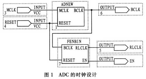圖1示出A/D轉(zhuǎn)換器的輸入時(shí)鐘設(shè)計(jì),MD轉(zhuǎn)換器工作在從模式下時(shí),需要外部提供RLCLK和BCLK。在主時(shí)鐘MCLK的輸入下,通過對(duì)MCLK 4分頻得到BCLK的信號(hào),用來作為位數(shù)據(jù)提取的信號(hào)。RLCLK是通過對(duì)BCLK的32分頻得到的,用來區(qū)分左右通道的數(shù)據(jù),同時(shí)輸出EN信號(hào)作為后續(xù)處理的同步信號(hào)。