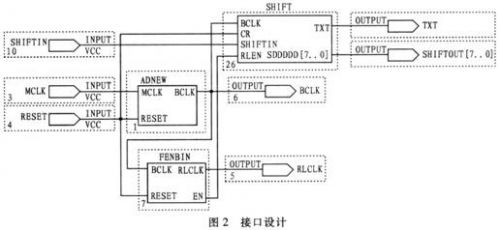 在圖2中,輸入為MCLK(主時(shí)鐘)、RESET(啟動(dòng)信號(hào))和SHIFTIN(A/D輸出數(shù)據(jù)),輸出為RL(左右?guī)盘?hào))、BCLK(A/D數(shù)據(jù)位時(shí)鐘),TXT(并行數(shù)據(jù)讀取控制)和SHIFTOUT(并行數(shù)據(jù)輸出)。通過時(shí)鐘控制輸出BCLK和 RLCLK到AD1871,AD1871傳出數(shù)據(jù)SHIFTIN進(jìn)入SHIFT模塊,SHIFT模塊在正確的位時(shí)鐘下讀取SHIFTIN的輸入數(shù)據(jù),并進(jìn)行串,并轉(zhuǎn)換,之后輸出8位或12位的數(shù)據(jù)。同時(shí)輸出TXT并行數(shù)據(jù)讀取控制。